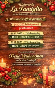 Zum Jahresausklang lädt das Ristorante La Famiglia im Sportheim des VfB Altheim alle Gäste herzlich ein, den Jahreswechsel kulinarisch zu feiern. Freuen Sie sich auf ein festliches Silvester-Menü mit ausgewählten italienischen Spezialitäten – perfekt für einen genussvollen Abend in gemütlicher Atmosphäre.Unser… Silvester-Menü im Ristorante „La Famiglia“ – Genuss zum Jahreswechsel 🎆 weiterlesen - Weihnachtsöffnungszeiten im Ristorante La Famiglia